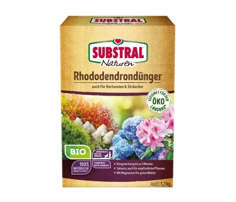 SUBSTRAL Naturen BIO gnojilo za rododendrone je popolno organsko-mineralno gnojilo za rododendrone, hortenzije, iglavce in grmovnice z dolgotrajnim delovanjem. Narejeno iz rastlinskih, živalskih ali naravnih mineralnih sestavin, brez kemičnih dodatkov. Je naravno in okolju prijazno gnojilo.