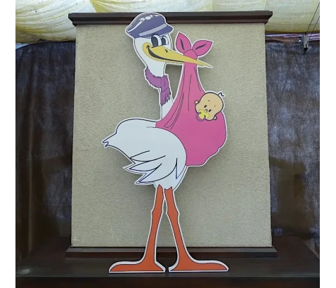 Štorklja iz umetne mase, živahnih barv .Ima letev za podporo, tako da samostojno stoji. Ob rojstvu punčke. Višina: 115 cm