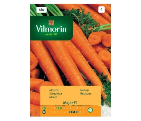 Major F1 korenje je srednje zgodnja sorta (100 dni) oranžno rdečih korenov, lepe oblike, dolgih okoli 15 cm, prijetnega okusa in lahko prebavljivih. Setev: april -maj Spravilo pridelka: avgust - oktober
