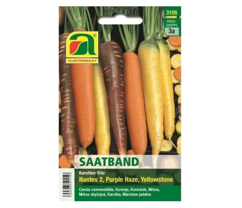 Semena korenčka na setvenem traku dolžine 4 m. Sorte: Nantes 2/Topfix, Purple Sun F1, Yelllowstone Setev v rastlinjak: januar - februar Setev na prosto: marec - julij Spravilo pridelka: junij - november Cenovna skupina: 3 a
