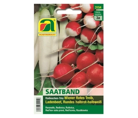 Tri sorte redkvice na setvenem traku dolžine 4 m. Sorte: Wiener Rotes Treib, Ladenbeet, Rundes halbrot - halbweiß Setev v rastlinjak: april - julij Setev na prosto: marec - avgust Cenovna skupina: 3 a