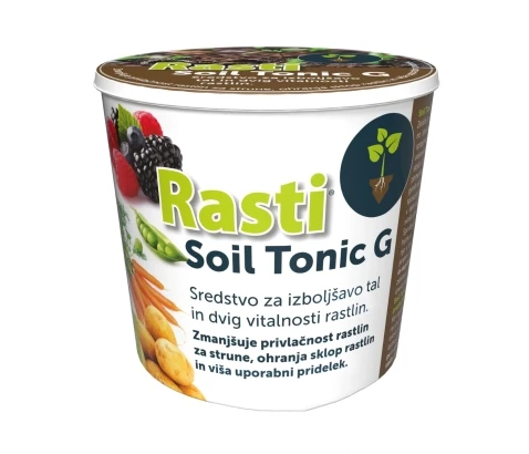 Rasti Soil Tonic G je kombinacija zeolita in rastlinskih ekstraktov za spodbujanje rasti in zaščito pred talnimi škodljivci. Primeren za vse vrtnine, poljščine in jagodičje. Uporablja se ob setvi ali sajenju z vdelavo v tla. Naraven izdelek brez škodljivih učinkov na okolje. Zagotavlja boljši prijem sadik, spodbuja rast in ščiti pred škodljivci. Idealen za ekološko pridelavo.
