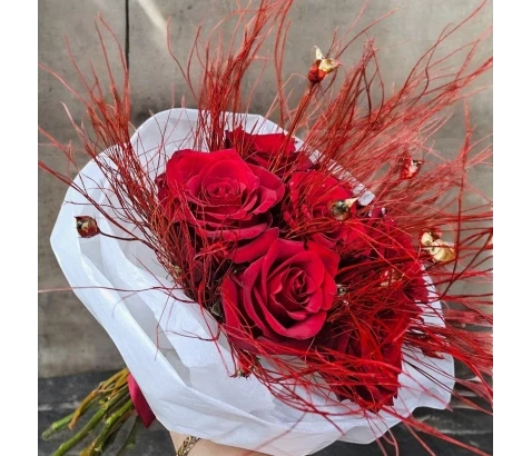 Sedem rdečih velikocvetnih vrtnic, barvana borovnica in eleganten okrasni papir s pentljo – tako kot ta šopek je tudi moja ljubezen do tebe edinstvena in brezčasna. ❤️"