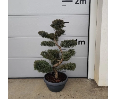 Zimzeleni iglavec Juniperus Chinensis 'Pfitzeriana Glauca' gojen na obliko bonsaja. Tla morajo biti dobro propustna in hranilna. Rastlina je primerna za sonče lege, za vdrževanje oblike je potrebna rez. Višina z loncem 150-160cm, c50l. Pred nakupom preveri zalogo v Vrtni center Frbežar.
