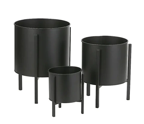 Set 3 loncev Jessy črne barve na kovinskih podstavkih. Lonci so različnih dimenzij. Manjši: 20x15cm Srednji: 29x22cm Večji: 25x27cm