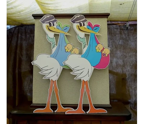Štorklja iz umetne mase, živahnih barv .Ima letev za podporo, tako da samostojno stoji. Ob rojstvu dvojčkov - fantka in punčke. Višina: 115 cm