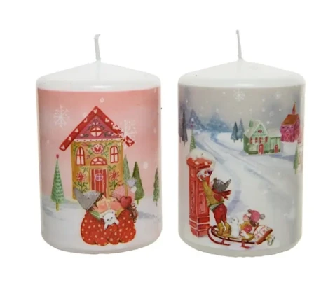 Bela dekorativna sveča s potiskom otroške igre na snegu v prazničnem času Dimenzije: 7 x 10 cm