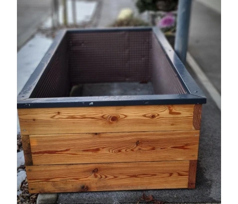 Visoka greda narejena iz lesa oljnega macesna v različnih velikostih. Notranji del je za daljšo življenjsko dobo dodatno zaščiten s čepasto folijo. Zgornji robovi so obdani z rjavo kovinsko preobleko.