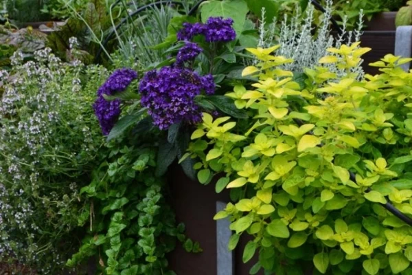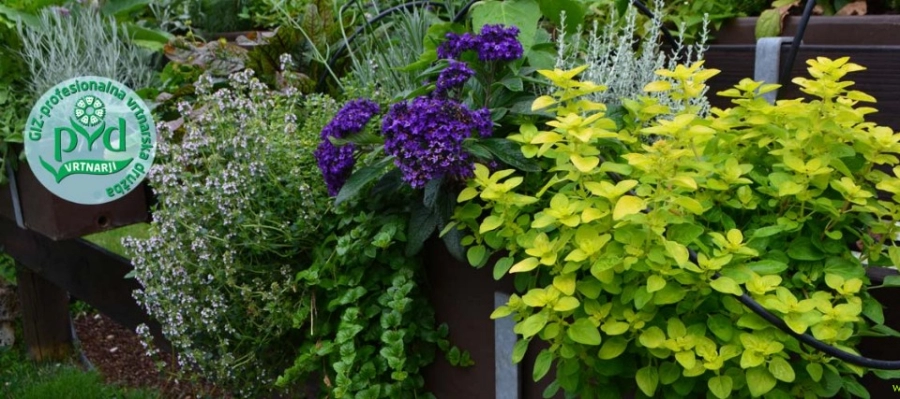 Moderna zasaditev-okrasna, dišeča in uporabna (zlati origano, vaniljevka, viseča meta, timijan, sivka, smilj, rdečelistna kislica)