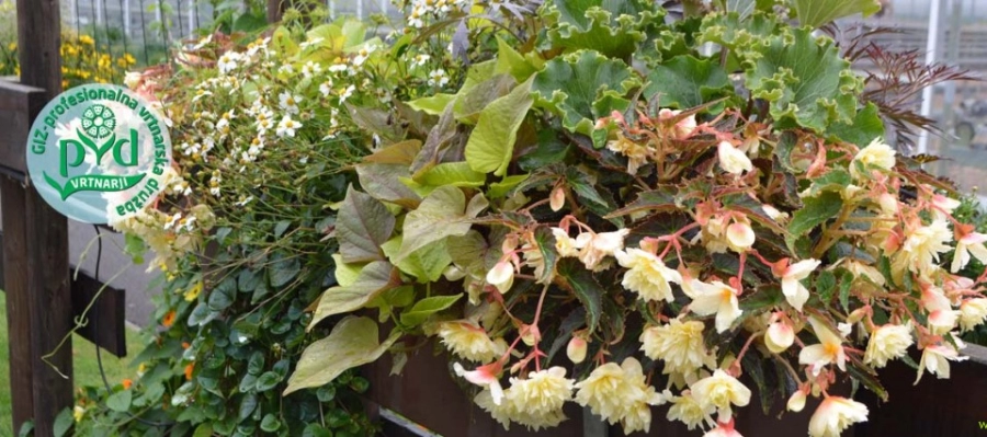 Begonija 'Double Cream', sladki krompir 'Dijon', zelena pijavčnica' Sunbrst', beli bidens, farfugij kot zeleni dodatek-trendovska zasaditev