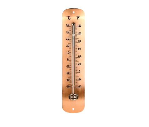 Klasičen termometer z bakrenim zaključnim videzom, primere tako za notranje kot tudi zunanje prostore. Temperaturna skala prikazuje vrednosti v celziju in farenhaitu.
