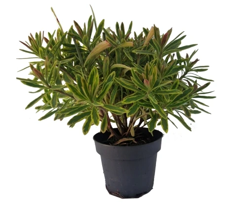 -Listje: Zimzeleno, sivo - zelene liste z zlatimi robovi, ki se v hladnejših mesecih obarvajo rožnato.
