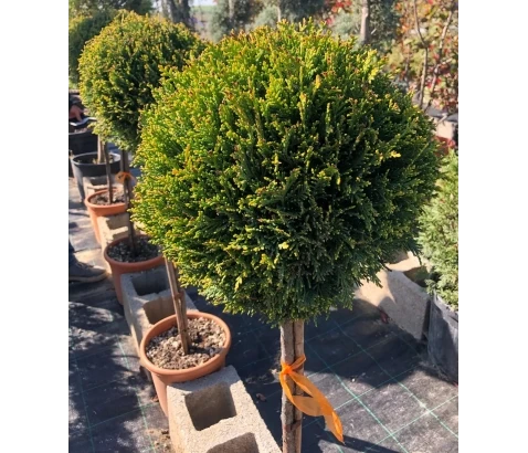Zimzeleni iglavec, z luskastimi iglicami, ki so zeleno rumene, mladi poganjki so zlato rumeni. Starejša rastlina je bila z obrezovanjem oblikovana v KROGLO NA STEBLU in le tega moramo potem naprej redno obrezovati, če želimo obliko obdržati. To je rastlina, ki zelo dobro prenaša sušo, tla morajo biti dobro propustna in hranilna, lega pa sončna.