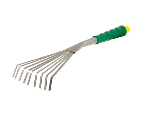 Mini grablje iz nerjavečega jekla z 9 zobi in ročajem iz umetne mase.