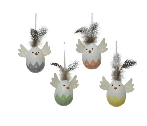 Jajce-piščanček s perjem za obesit. Dimenzije: 5 x 8 x 8 cm