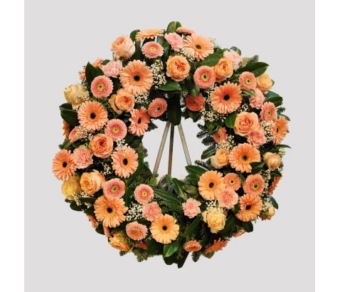 Žalni venec umirjene kombinacije mareličnih vrtnic, gerber in šlajerja. V Vrtnem centru in cvetličarni Frbežar imamo v ponudbi celostno obl...